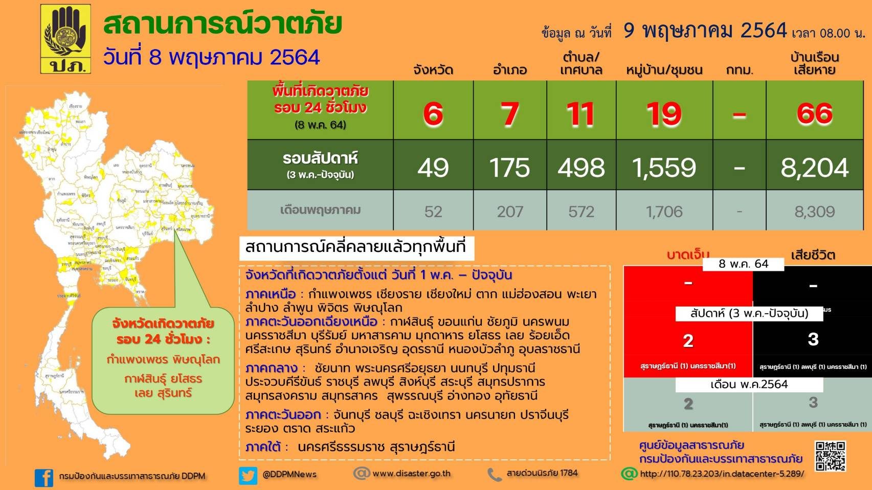โดยตั้งแต่วันที่ 1-9 พ.ค.64 เวลา 06.00 น. มีพื้นที่ประสบวาตภัย 52 จังหวัด 207 อำเภอ 572 ตำบล 1,706 หมู่บ้าน บ้านเรือนเสียหาย 8,309 หลัง ผู้เสียชีวิต 3 ราย (สุราษฎร์ธานี ลพบุรี และนครราชสีมา จังหวัดละ 1 ราย) ผู้บาดเจ็บ 2 ราย (สุราษฎร์ธานี 1 ราย นครราชสีมา 1 ราย) แยกเป็น