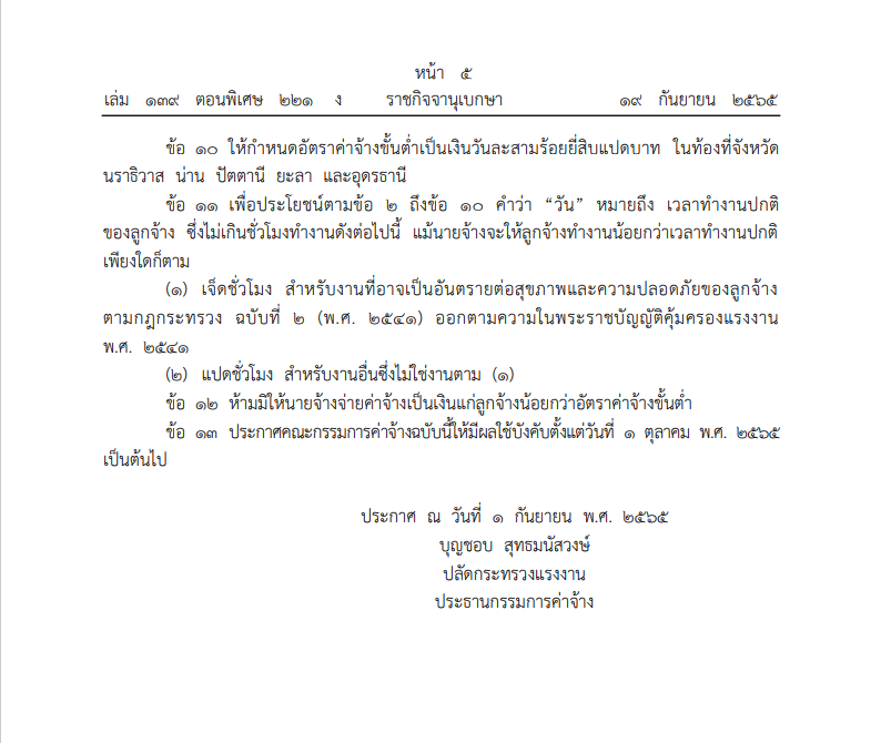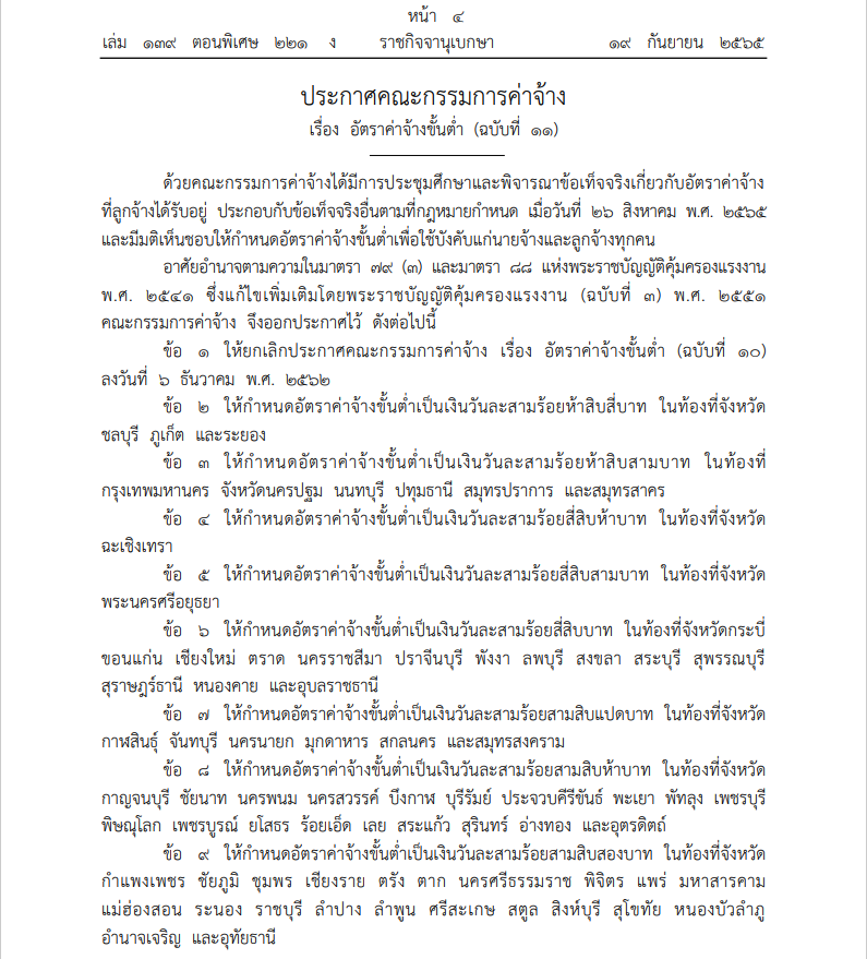 วันที่ 19 ก.ย.2565 เว็บไซต์ราชกิจจานุเบกษา เผยแพร่ ประกาศคณะกรรมการค่าจ้าง เรื่อง อัตราค่าจ้างขั้นต่ำ (ฉบับที่ 11) ใจความว่า