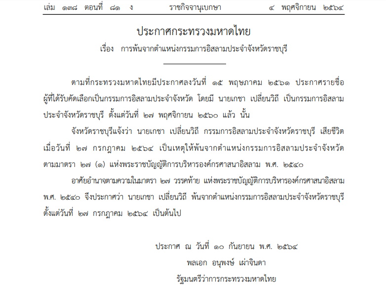 วันที่ 4 พฤศจิกายน 2564 เว็บไซต์ราชกิจจานุเบกษา เผยแพร่ประกาศกระทรวงมหาดไทย เรื่องการพ้นจากตำแหน่งกรรมการอิสลามประจำจังหวัดราชบุรี ลงนามโดยพล.อ. อนุพงษ์ เผ่าจินดา รัฐมนตรีว่าการกระทรวงมหาดไทย