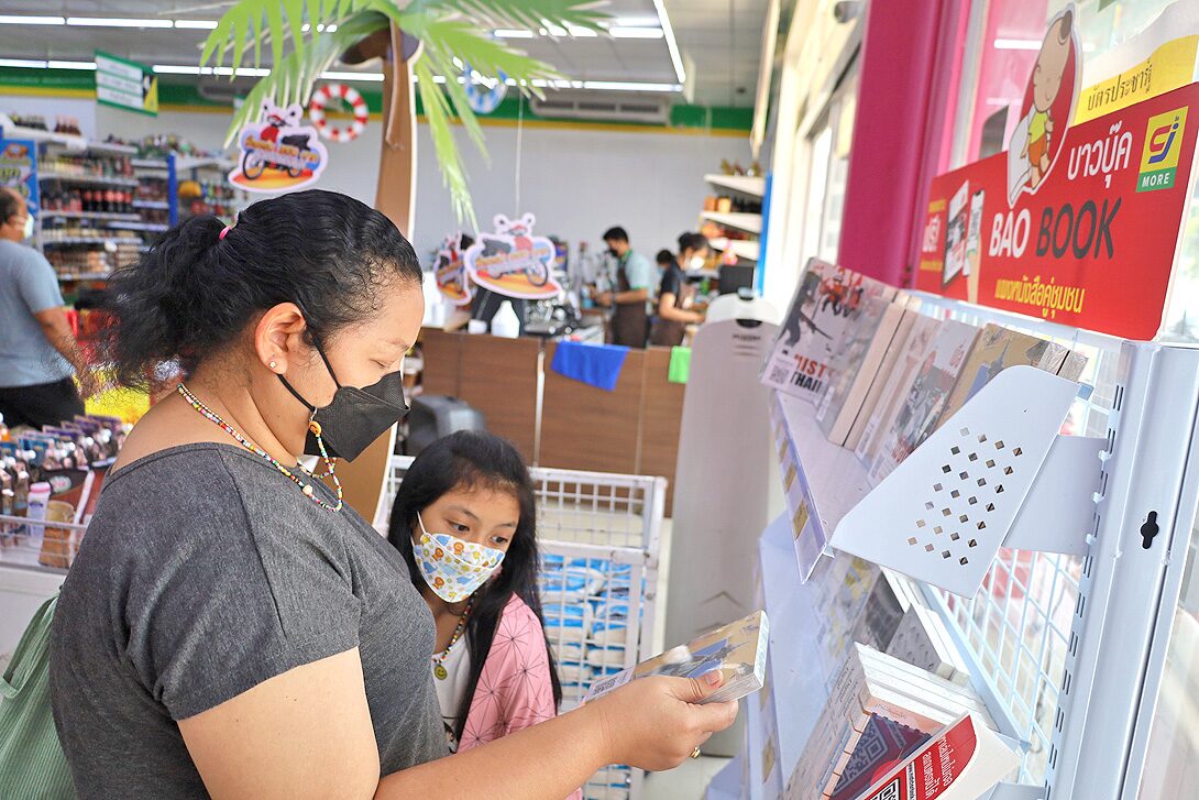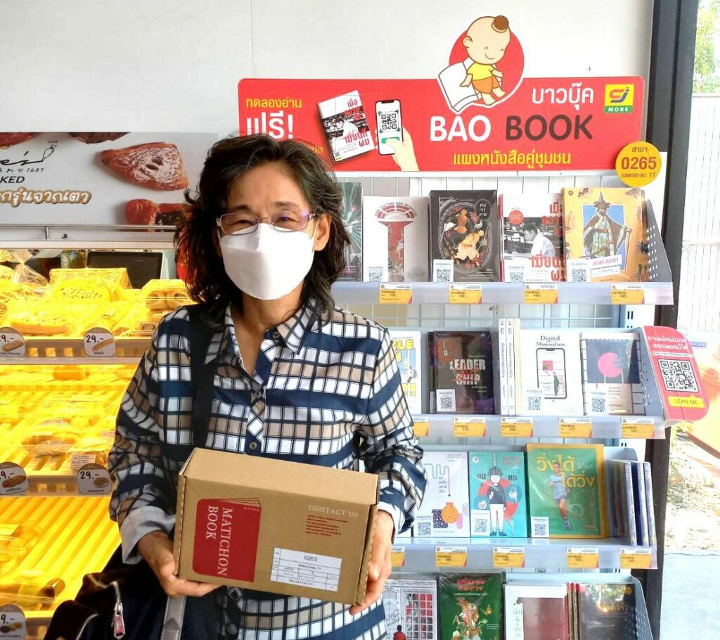 อีกสาขาในพระนครศรีอยุธยา อย่าง ซีเจ ซูเปอร์มาร์เก็ต สาขาบางไทร ซึ่งมีลูกค้ามาใช้บริการและเลือกซื้อสินค้าตลอดทั้งวัน ก็มีผู้ให้ความสนใจใน ‘BAO BOOK’ บาวบุ๊ค ซึ่งตั้งอยู่ข้างจุดชำระเงิน ที่น่าสนใจคือข้อสังเกตจากพนักงานที่ว่า สาขานี้ ลูกค้าบาวบุ๊คส่วนใหญ่เป็น ‘นักศึกษา’ ซึ่งมักสอบถามหาหนังสือเล่มอื่นๆ ของสำนักพิมพ์มติชนเพิ่มเติมหลังทดลองอ่านผ่านคิวอาร์โค้ดบนปกเล่มที่วางแผง