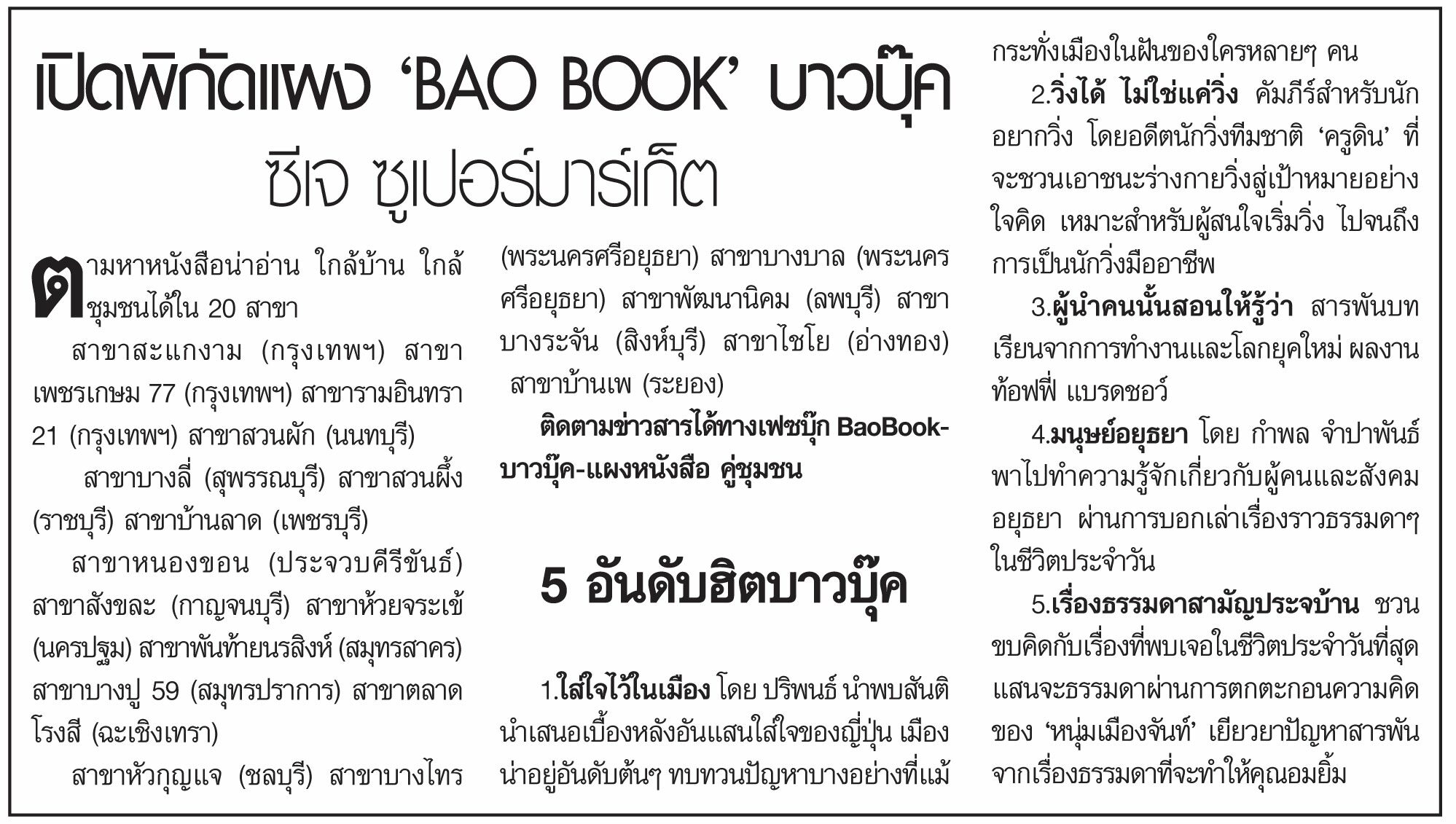 เปิดตัวอย่างเป็นทางการไปแล้วเมื่อ 11 มีนาคมที่ผ่านมา สำหรับ ‘BAO BOOK’ บาวบุ๊ค แผงหนังสือคู่ชุมชนใน ซีเจ ซูเปอร์มาร์เก็ต ร้านค้าปลีกที่อยู่ใกล้ชิดชุมชนทั่วประเทศ ด้วยความร่วมมือระหว่างคาราบาว กรุ๊ปและเครือมติชน นำโดยหัวเรือใหญ่ผู้รักในหนังสืออย่าง เสถียร เศรษฐสิทธิ์ ประธานกรรมการ ประธานคณะกรรมการบริหาร และประธานเจ้าหน้าที่บริหาร บริษัทคาราบาวกรุ๊ป จำกัด (มหาชน) และประธานกรรมการ บริษัท ซี.เจ. เอ็กซ์เพรส กรุ๊ป จำกัด และ ขรรค์ชัย บุนปาน ประธานกรรมการ บริษัท มติชน จำกัด (มหาชน)