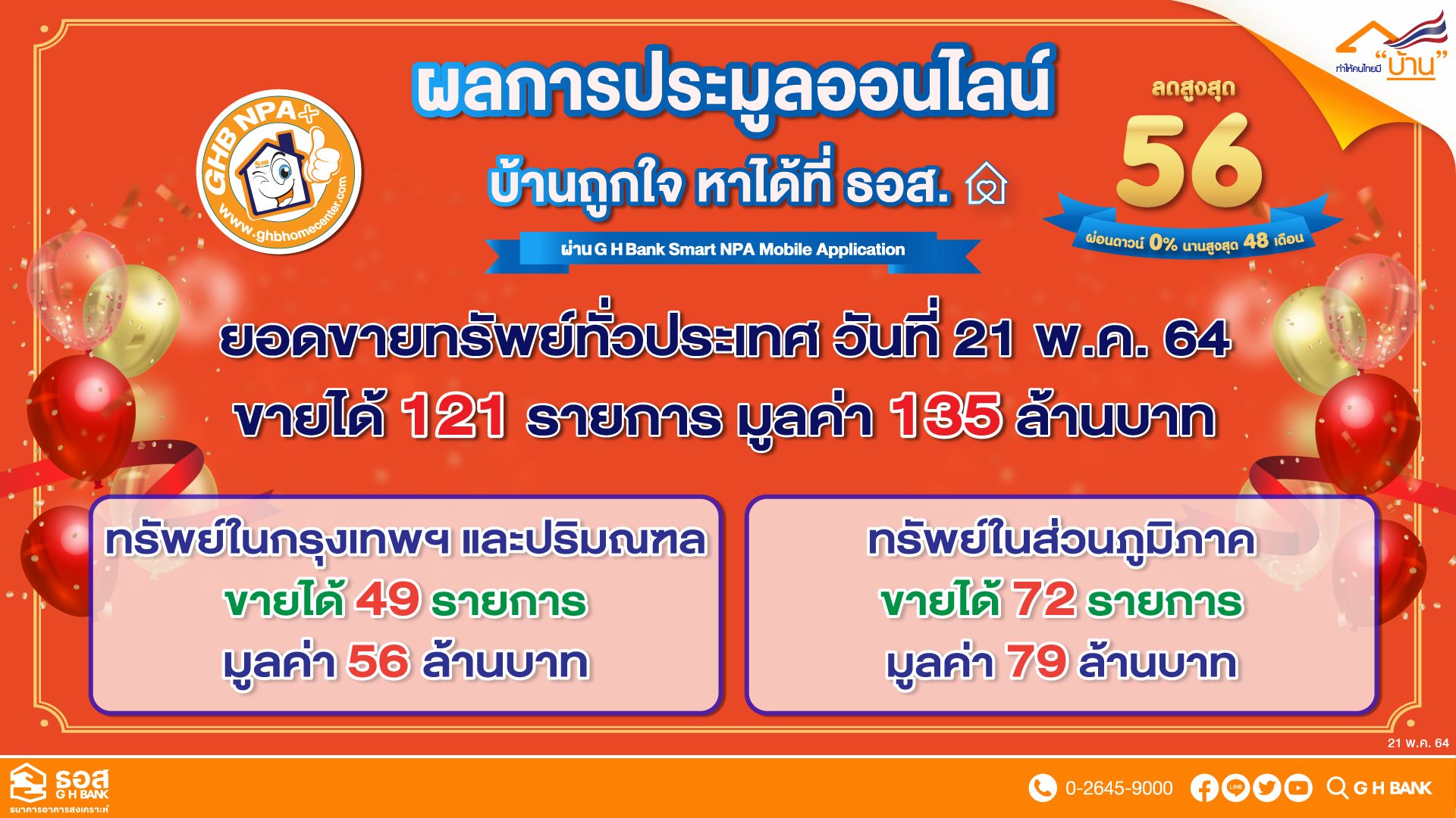 นายฉัตรชัย ศิริไล กรรมการผู้จัดการ ธนาคารอาคารสงเคราะห์ (ธอส.) กล่าวถึงผลการจัดงาน ประมูลออนไลน์ บ้านถูกใจ หาได้ที่ ธอส. ลดการแพร่ระบาดของเชื้อไวรัส COVID-19 ประมูลซื้อบ้านผ่าน Application : G H Bank Smart NPA ในวันนี้ (21 พฤษภาคม 2564) ระหว่างเวลา 12.00-13.00 น. สามารถจำหน่ายทรัพย์ได้เป็นจำนวน 121 รายการ คิดเป็นมูลค่าที่จำหน่ายได้รวม 135 ล้านบาท แบ่งเป็นทรัพย์ที่ตั้งอยู่ในพื้นที่กรุงเทพฯและปริมณฑล จำนวน 49 รายการ และทรัพย์ในส่วนภูมิภาค 72 รายการ โดยทรัพย์ที่ประมูลขายได้ในราคาสูงสุด คือ ทรัพย์ประเภทบ้านเดี่ยว 2 ชั้น ขนาด 1,824 ตารางวา อ.แหลมสิงห์ จ.จันทบุรี จำหน่ายได้ในราคา 6,115,000 บาท ส่วนทรัพย์ที่ประมูลขายได้ในราคาถูกที่สุด คือ ทรัพย์ประเภทที่ดินเปล่า ขนาดเนื้อที่ 229 ตารางวา ในโครงการสวนชมดอย อ.แม่ทะ จ.ลำปาง จำหน่ายได้ในราคา 200,000 บาท ขณะที่ทรัพย์ประเภทที่ดินเปล่า ขนาดเนื้อที่ 204 ตารางวา ในโครงการสวนผลไม้หนองนกกระเรียน อ.จอมบึง จ.ราชบุรี เป็นรายการที่มีผู้เข้าร่วมประมูลมากที่สุด จำนวน 16 ราย โดยปิดประมูลขายได้ในราคา 237,000 บาท จากราคาเริ่มต้น ประมูลที่ 82,000 บาท