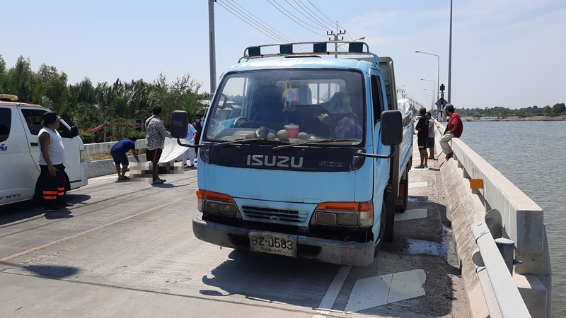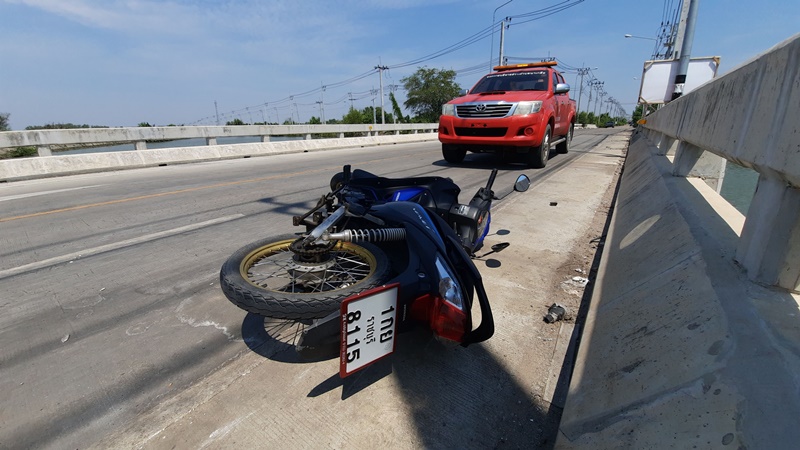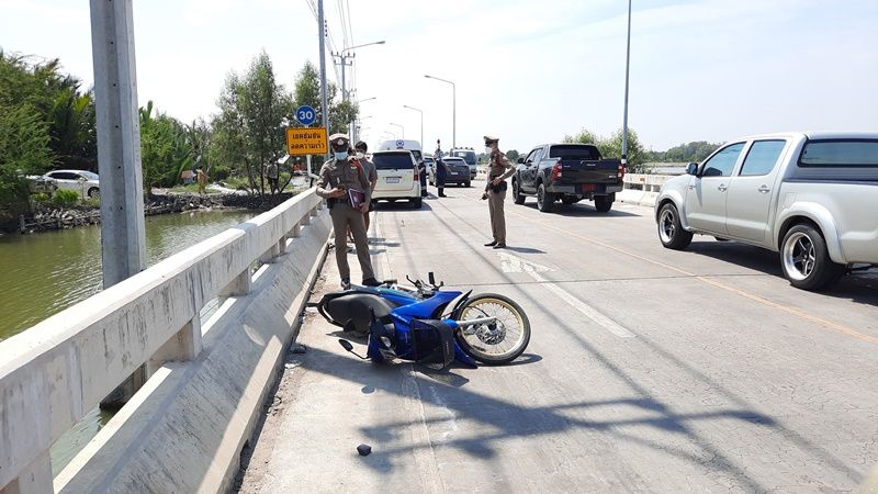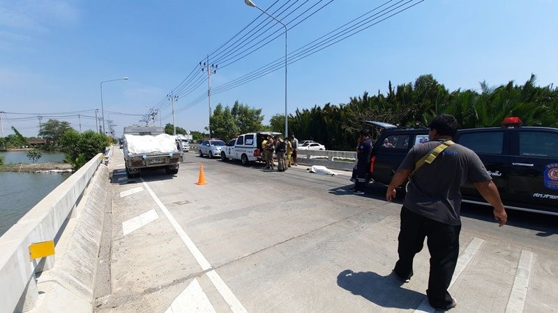 หนุ่มแมสเซนเจอร์สังเวยศพแรกถนนสายใหม่ คลองสวน-บ้านล่าง-สมุทรสาคร หลังแซงรถบรรทุกน้ำแข็งไม่พ้น อัดขอบสะพานดับ