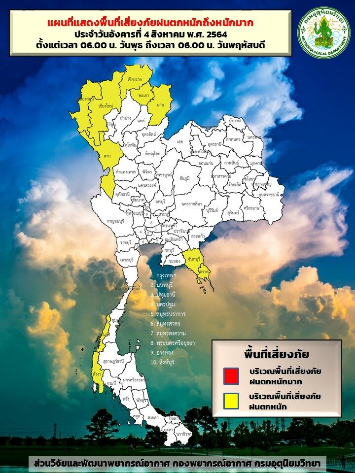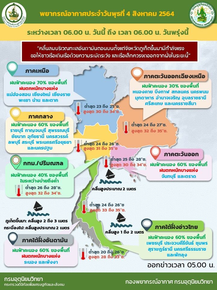 เมื่อวันที่ 4 สิงหาคม กรมอุตุนิยมวิทยา พยากรณ์อากาศ 24 ชั่วโมงข้างหน้า มรสุมตะวันตกเฉียงใต้กำลังค่อนข้างแรงพัดปกคลุมทะเลอันดามัน ประเทศไทย และอ่าวไทย ประกอบกับร่องมรสุมพาดผ่านประเทศเมียนมา ลาว และเวียดนามตอนบน เข้าสู่พายุดีเปรสชั่นบริเวณชายฝั่งประเทศจีนตอนใต้ ลักษณะเช่นนี้ทำให้ภาคเหนือ ภาคตะวันออก และภาคใต้ฝั่งตะวันตก มีฝนตกหนักบางแห่ง ขอให้ประชาชนบริเวณดังกล่าวระวังอันตรายจากฝนตกหนักและฝนที่ตกสะสม ซึ่งอาจทำให้เกิดน้ำท่วมฉับพลัน และน้ำป่าไหลหลากได้