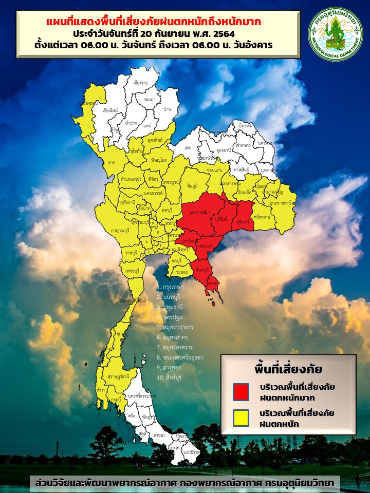 วันที่ 20 กันยายน 2564 กรมอุตุนิยมวิทยา พยากรณ์อากาศ 24 ชั่วโมงข้างหน้า ว่าลักษณะอากาศทั่วไป ร่องมรสุมพาดผ่านภาคเหนือตอนล่าง ภาคกลางตอนบน ภาคตะวันออก และภาคตะวันออกเฉียงเหนือตอนล่าง เข้าสู่หย่อมความกดอากาศต่ำบริเวณประเทศเวียดนามตอนกลาง
