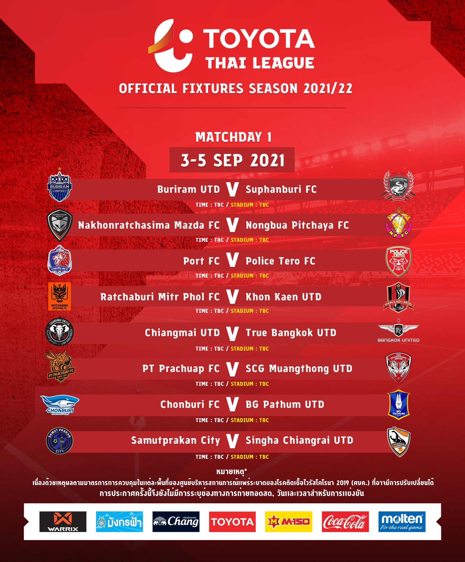 โดยคู่สำคัญคือแชมป์เก่า “เดอะ แรบบิท” บีจี ปทุม ยูไนเต็ด จะต้องบุกไปเยือน “ฉลามชล” ชลบุรี เอฟซี ที่ชลบุรี สเตเดียม ขณะที่ “ปราสาทสายฟ้า” บุรีรัมย์ ยูไนเต็ด เองจะได้เล่นในบ้านรับมือกับ “ช้างศึกยุทธหัตถี” สุพรรณบุรี เอฟซี