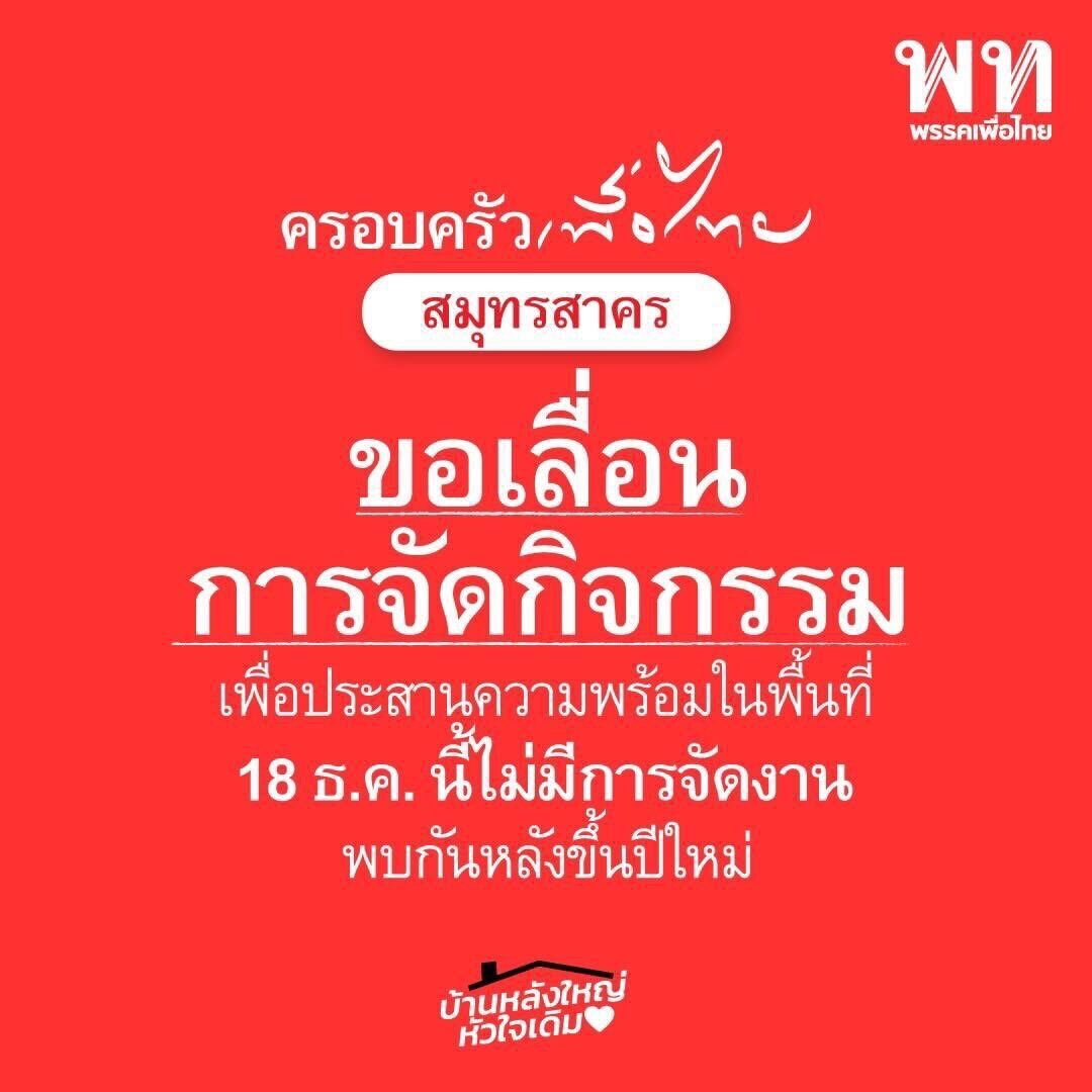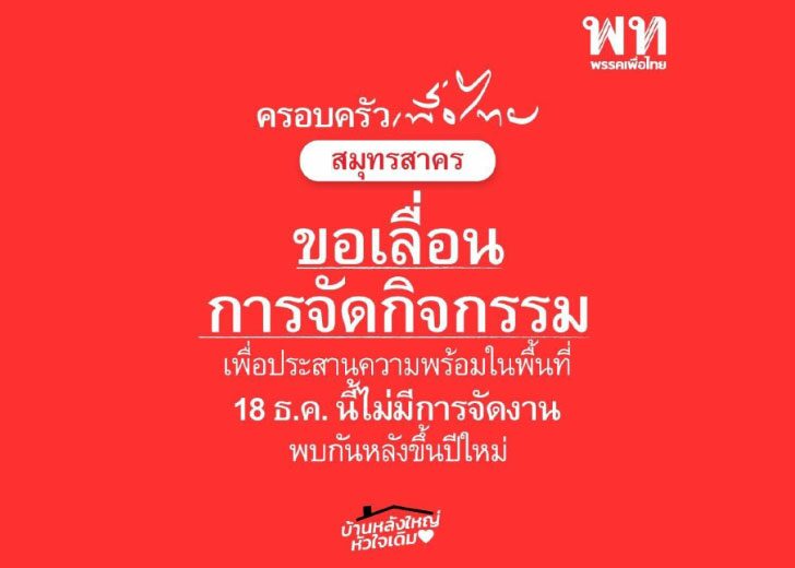 เมื่อวันที่ 15 ธันวาคม ผู้สื่อข่าวรายงานว่า พรรคเพื่อไทย (พท.) ได้ขอเลื่อนการจัดกิจกรรม ครอบครัวเพื่อไทยสัญจรที่ จ.สมุทรสาคร เพื่อพบปะประชาชน และปราศรัยในหัวข้อ “การยกระดับเศรษฐกิจเดินหน้าค่าแรงขั้นต่ำ 600 บาทต่อวัน เงินตอบแทนปริญญาตรี 25,000 บาทต่อเดือน” พร้อมแนะนำตัวผู้ประสงค์ลงสมัครรับเลือกตั้ง ส.ส.ในกลุ่มภาคกลางบางส่วนและภาคตะวันตก ได้แก่ สมุทรสาคร สมุทรสงคราม ราชบุรี เพชรบุรี ประจวบคีรีขันธ์ กาญจนบุรี และนครปฐม ที่หอประชุมเอนกประสงค์ เทศบาลนครอ้อมน้อย จ.สมุทรสาคร ในวันที่ 18 ธันวาคมนี้ เวลา 09.00-11.30 น.