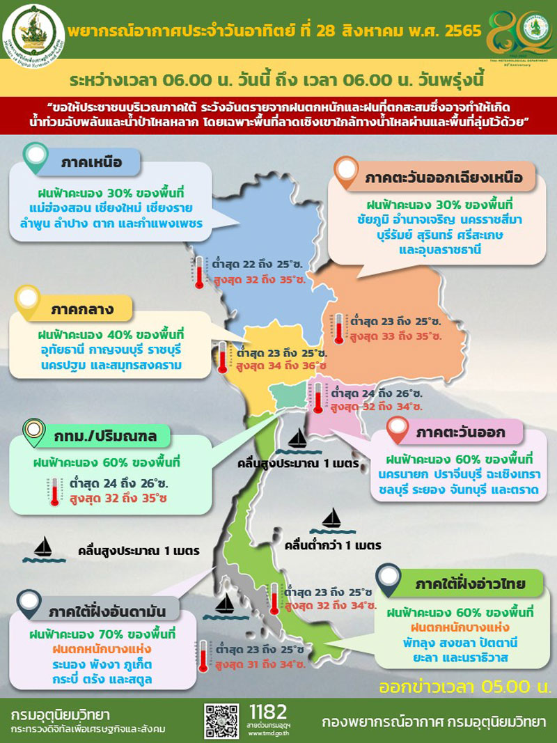 กรมอุตุนิยมวิทยา รายงานลักษณะอากาศทั่วไป ประจำวันที่ 28 สิงหาคม 2565 พยากรณ์อากาศ 24 ชั่วโมงข้างหน้า มรสุมตะวันตกเฉียงใต้ที่พัดปกคลุมทะเลอันดามัน ประเทศไทย และอ่าวไทยมีกำลังอ่อน ลักษณะเช่นนี้ทำให้ประเทศไทยตอนบนมีฝนลดลง แต่ยังคงมีฝนฟ้าคะนองเกิดขึ้นได้ ส่วนมากบริเวณด้านรับมรสุม และมีฝนตกหนักบางแห่งบริเวณภาคใต้ ขอให้ประชาชนในบริเวณดังกล่าวระวังอันตรายจากฝนตกหนักและฝนที่ตกสะสม ซึ่งอาจทำให้เกิดน้ำท่วมฉับพลันและน้ำป่าไหลหลาก โดยเฉพาะพื้นที่ลาดเชิงเขาใกล้ทางน้ำไหลผ่านและพื้นที่ลุ่มไว้ด้วย